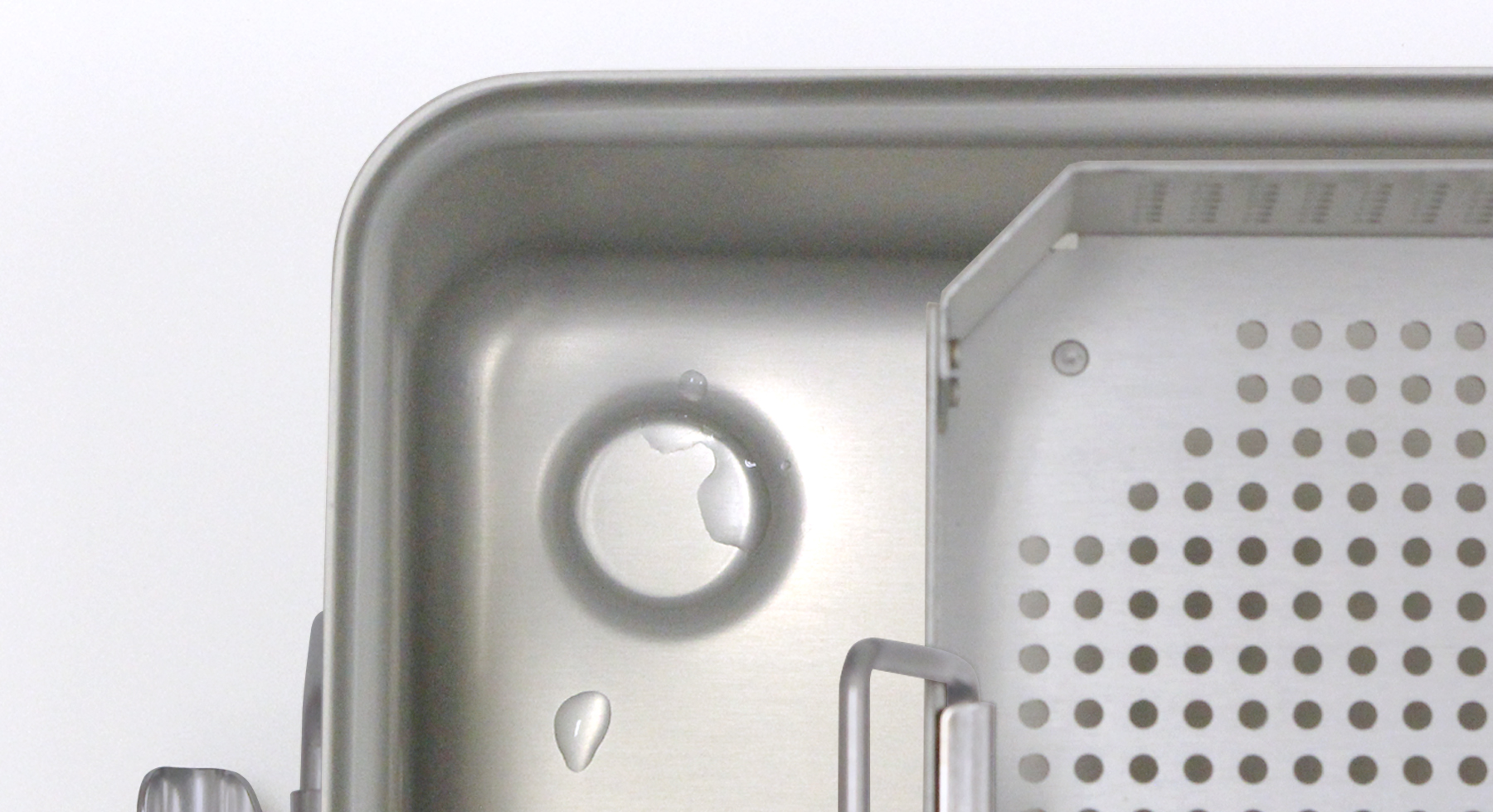 器材から容器の底に水が滴った場合の1つ目の対策は、底面に孔があるタイプの滅菌コンテナを使用することをおすすめします。