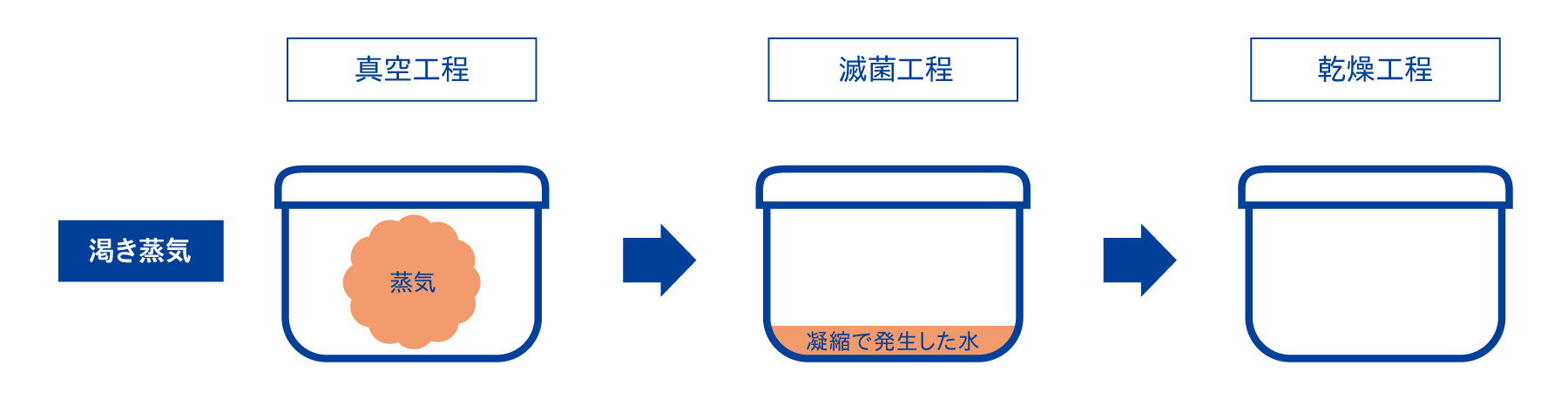| ① | 真空工程 | 包装材や器材内部の空気が蒸気に入れ替わり、器材が濡れる。 |
