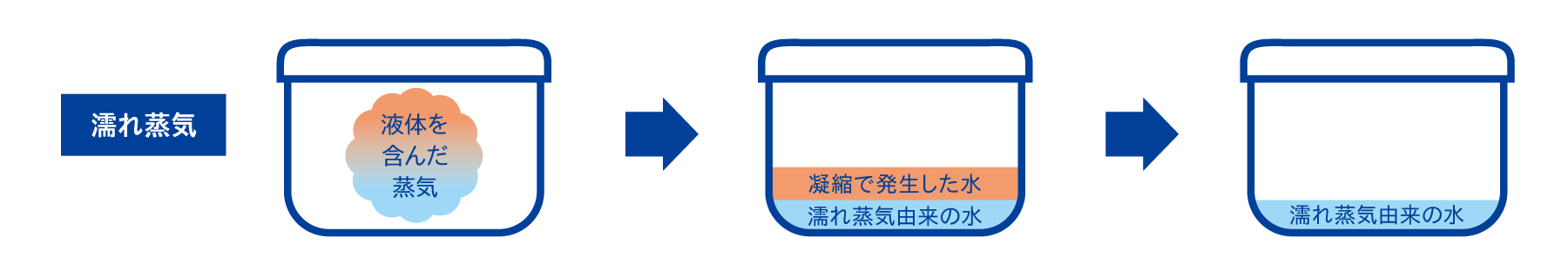 しかし、使用される蒸気が濡れていればその収支は合わず、器材表面に付着する水の量=(器材を温めるのに必要な水の量 + 蒸気に含まれている水の量)> 器材が乾燥できる水の量となり、乾燥不良が発生することがあります。