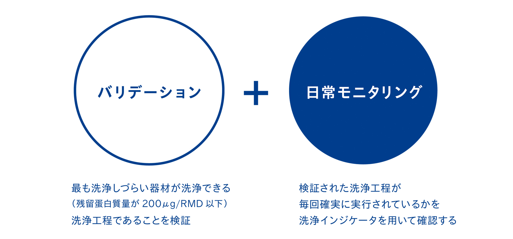 洗浄工程の評価は、「洗浄評価+日常モニタリング」で考えるのが基本です。洗浄評価された洗浄工程が、毎回確実に実行されているかを洗浄インジケータを用いて確認することで保証します。今回の検証では、洗浄評価の実施に合わせて適切な洗浄インジケータの選定試験も行いました。