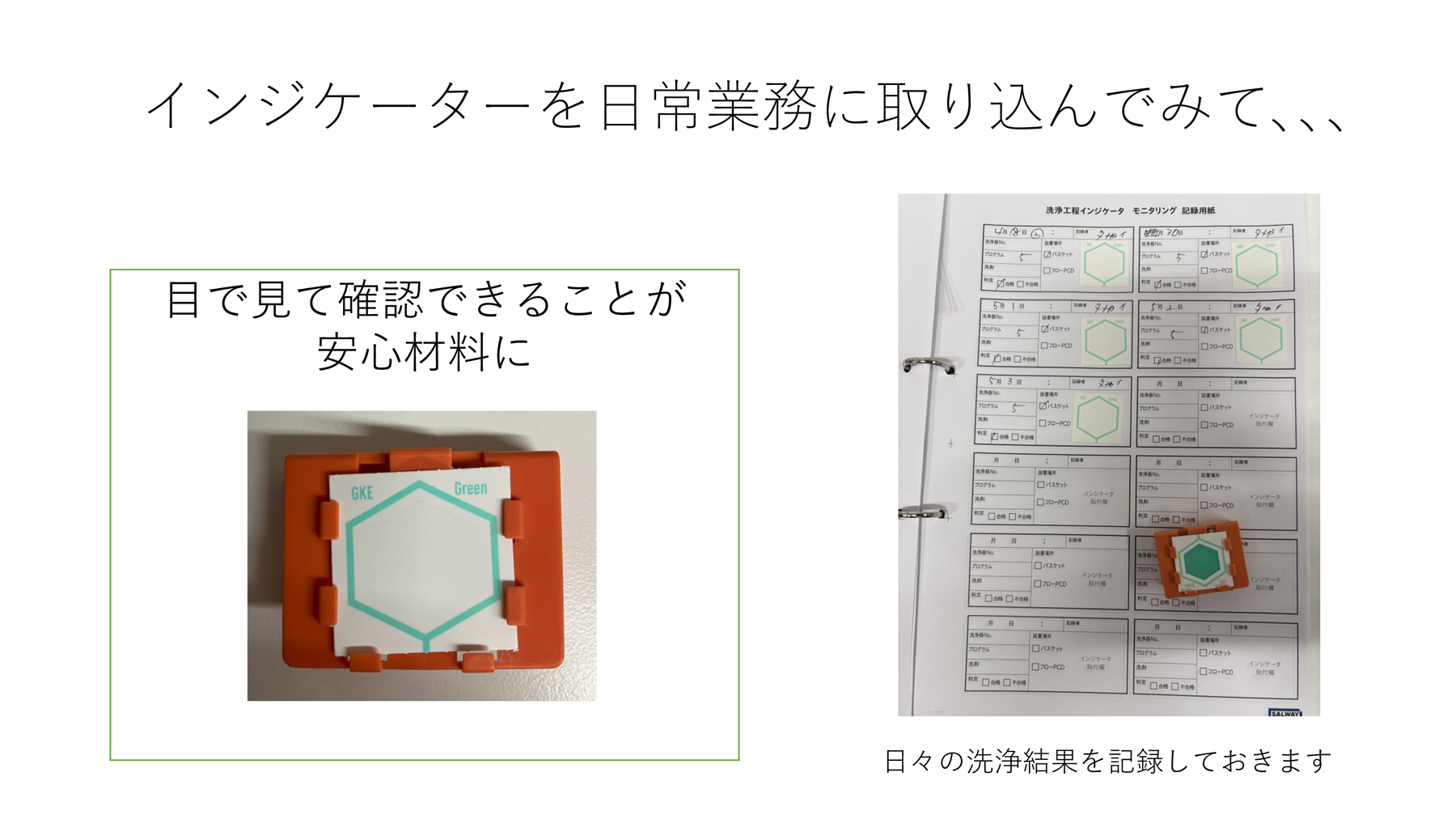 これらの検証試験の結果により、緑色の洗浄インジケータで日常モニタリングを行い、その変色が悪い時には器材も適切に洗浄できていない可能性が極めて高い、ということがわかるようになりました。